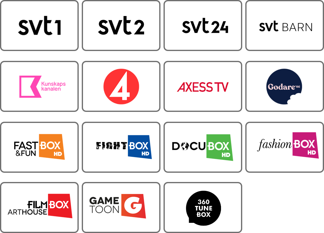 SVT1, SVT2, SVT24, SVT Barn/Kunskapskanalen, TV4, Axess TV, Godare, DocuBox, FashionBox, Fast&FunBox, FightBox, GameToon, FilmBox Arthouse och 36o TuneBox. Samt Play-biblioteken SVT Play, TV4 Play och Axess TV.